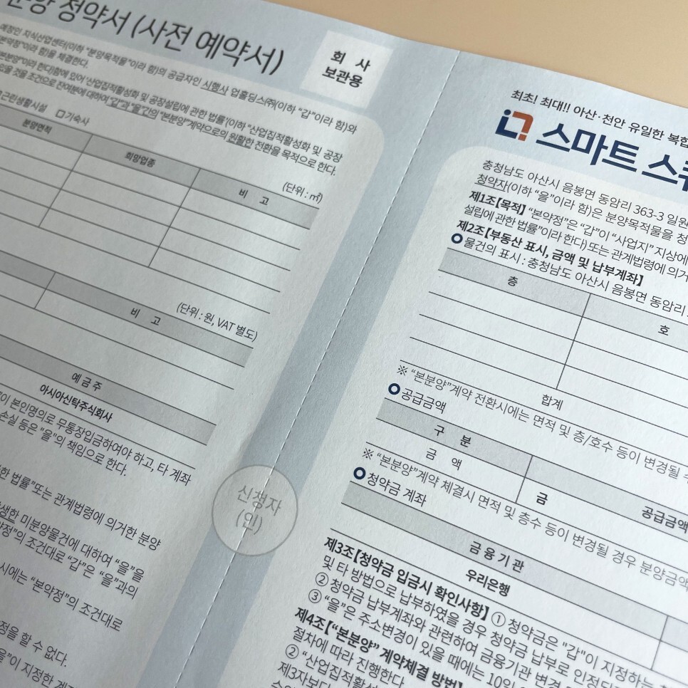 첫 번째는 2단 리플릿 형태의 계약서 및 약정서입니다.
