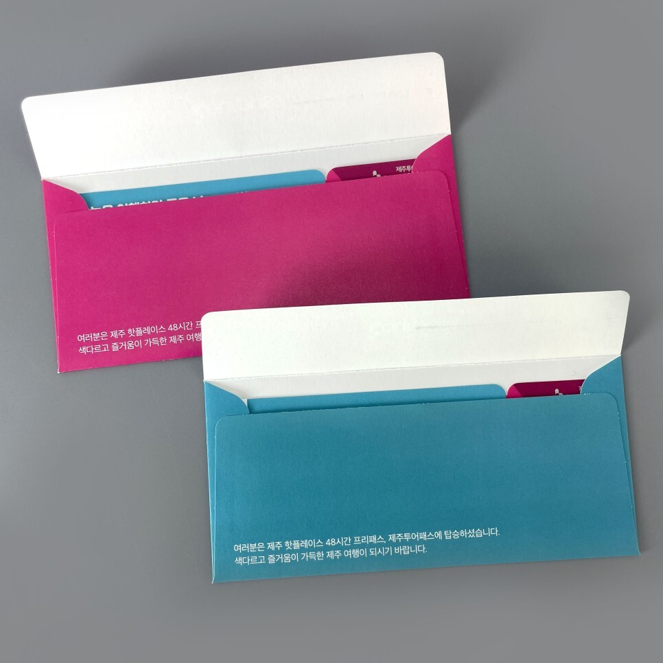 두 종류의 색으로 제작된 봉투와 티켓입니다.