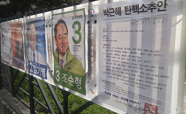 2016년 총선. 서울 서초을에 출마한 김수근 후보의 벽보에는 후보자 얼굴이 없었습니다. 대신 그 자리를 '박근혜 탄핵소추안' 전문이 빼곡하게 채웠습니다. 사진 대신 문서로 채운 벽보, 선거사에서 전례를 찾기 어려운 발상이었습니다.