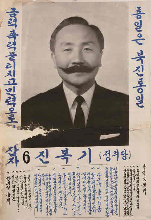 1971년 대선, 다른 후보들 사이에서 단연 눈에 띄는 벽보가 있었습니다. 바로 정의당 진복기 후보입니다. 양쪽 끝이 위로 굽어 올라간 '카이저 수염'을 기르고, 근엄한 표정으로 벽보에 등장했습니다.