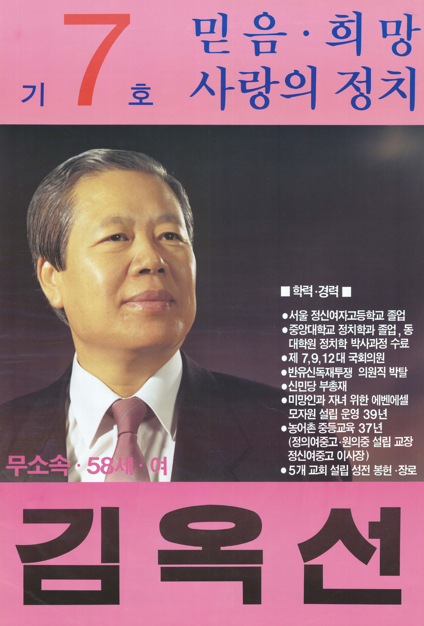 1992년 14대 대선에는 시각적으로 강렬한 벽보가 있었습니다. 무소속 김옥선 후보입니다. 수십 년간 남장으로 살아온 그녀의 벽보는 전형적인 남성 정치인 복장에, 위아래로 선명한 분홍색을 대담하게 배치해 눈길을 끌었습니다.