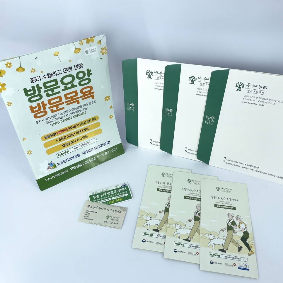 안녕하세요 에이프린트입니다. 요즘 에이프린트를 통해 디자인과 제작을 함께 맡겨주시는 클라이언트 분들이 많습니다. 인쇄에 있어서 품질도 정말 중요하지만 공공기관, 기업, 학교, 영업장, 개인 등의 특정 업체의 이미지와 인쇄물의 목적, 사용 대상 등에 어울리는 디자인을 잡는 것도 정말 중요합니다. 오늘은 한 방문요양센터에서 여러 가지 인쇄물을 제작과 함께 전체 디자인 의뢰 주신 사례를 소개해드리겠습니다. 대봉투, 양면 전단지, 3단 리플릿, 2가지의 스티커를 인쇄하였습니다. 방문요양이라는 기관의 취지에 맞게 따뜻한 색감의 초록색을 메인 컬러로 잡았습니다. 이렇게 한꺼번에 디자인을 맡겨주시면, 일정한 컨셉과 색감을 유지할 수 있어 한눈에 같은 기업, 기관의 홍보물임을 확인할 수 있습니..